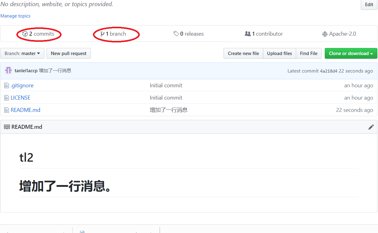 commits变成了2,branch的值变成了1,表示有了一个分支。 -
