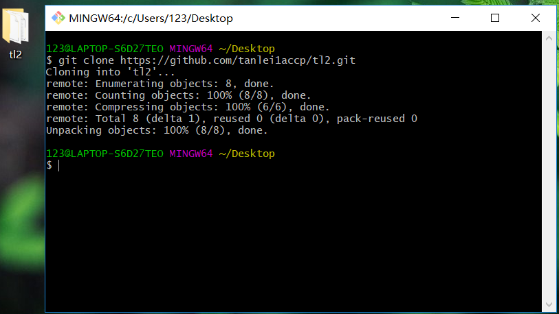 在弹出的窗口当中输入git clone https://github.com/tanlei1accp/tl2.git 会将远程的仓库下载到本地,桌面上会增加一个名称为tl2的文件夹,如下图: