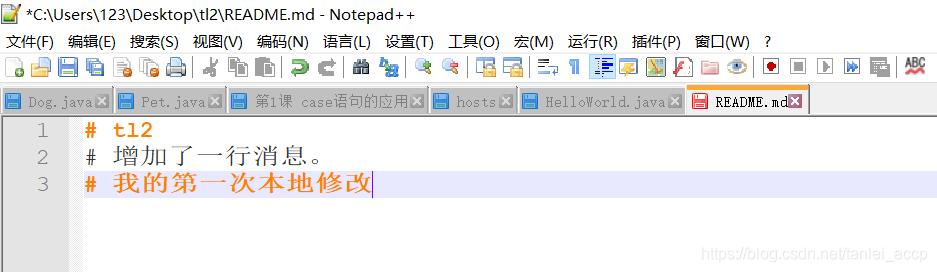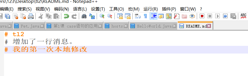 使用文本编辑器打开README.md文件,在里面增加内容“我的第一次本地修改”,如下图: