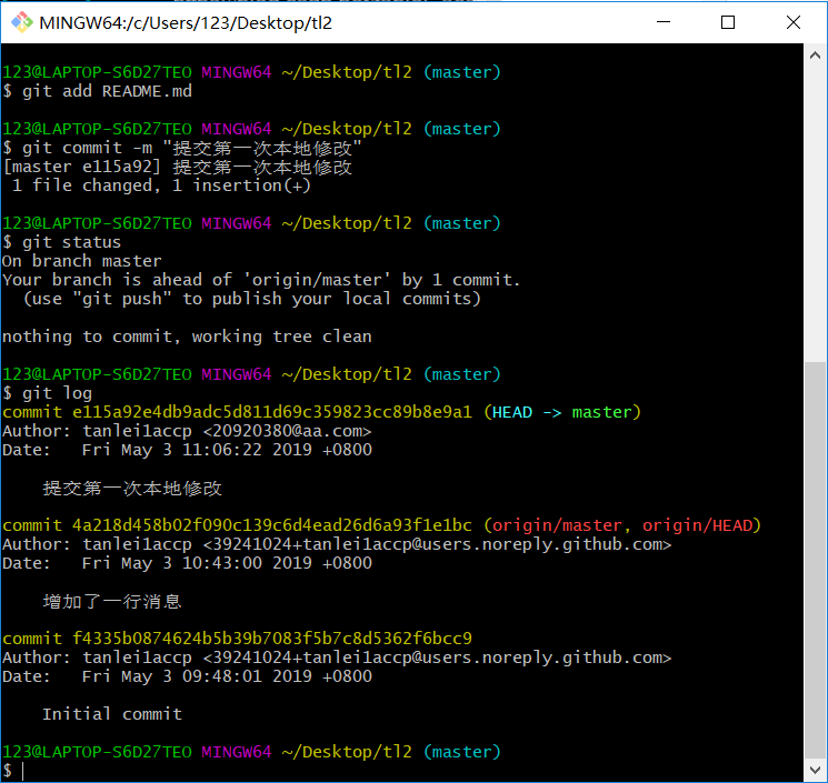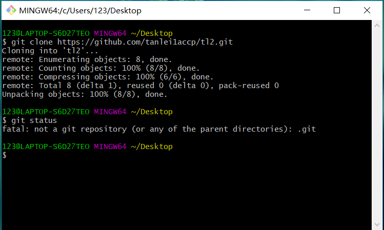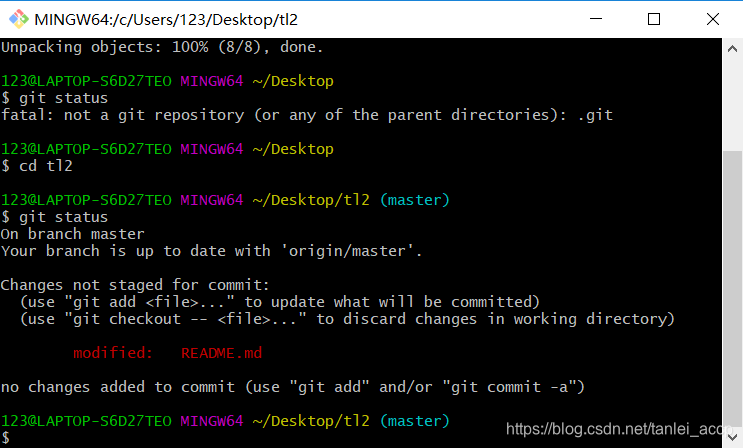 因为我们此时还是在桌面上,因此需要使用cd命令进入本地仓库的目录,键入cd tl2后再次输入git status查看状态,如下图: