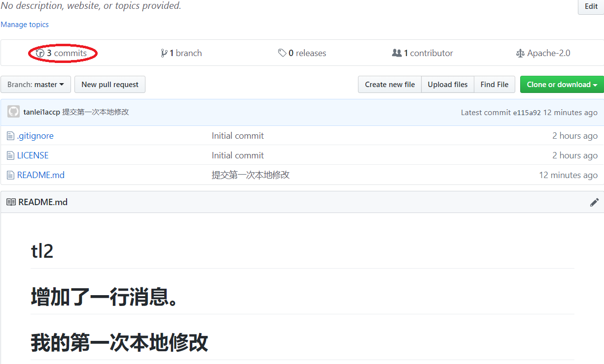 再看远程仓库的内容发现已经改变了,并且commits的数量变成了3,如下图: