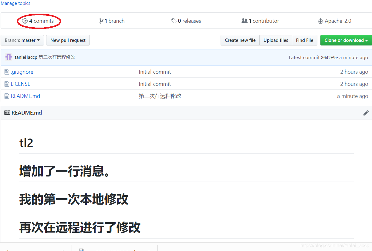 提交后在远程看到的信息,发现提交次数已经变成了四次,如下图: