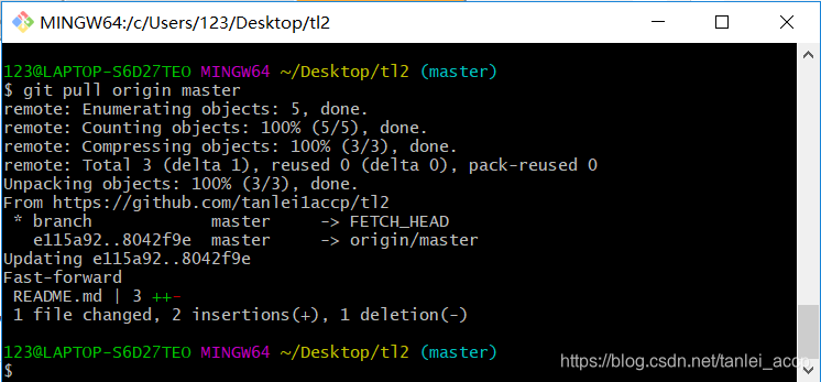 使用git pull origin master命令拉取远程仓库的代码到本地,使本地与远程仓库的代码同步,如下图: