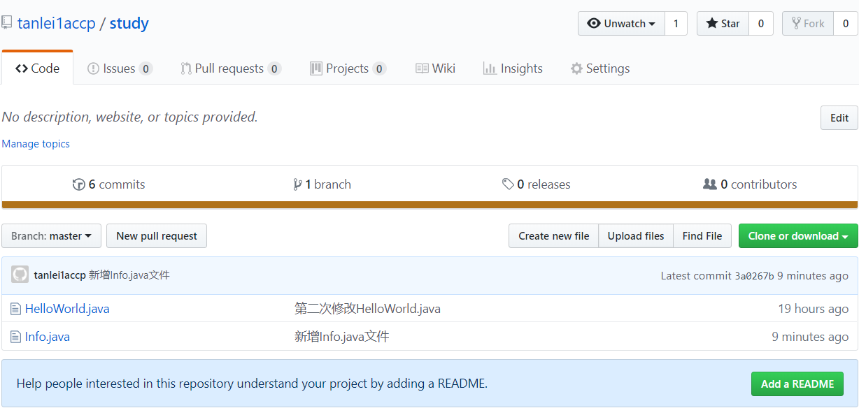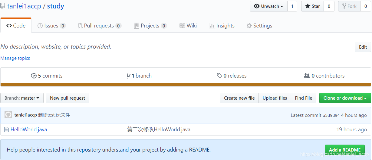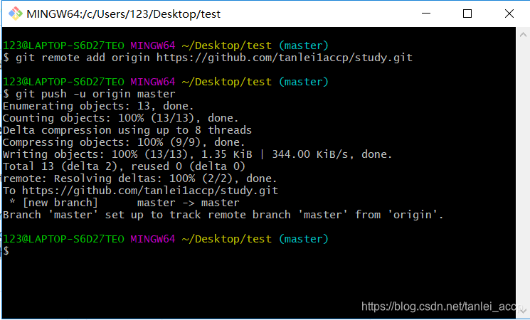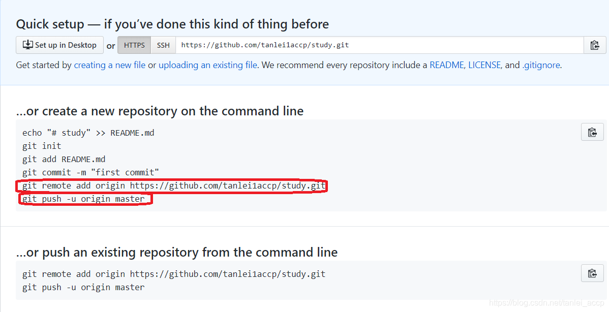 红色方框当中提示可以使用git remote add origin https://github.com/tanlei1accp/study.git命令将本地仓库同步到远程的study仓库。然后再使用git push -u origin master命令将本地仓库的内容推送到远程仓库中。 -