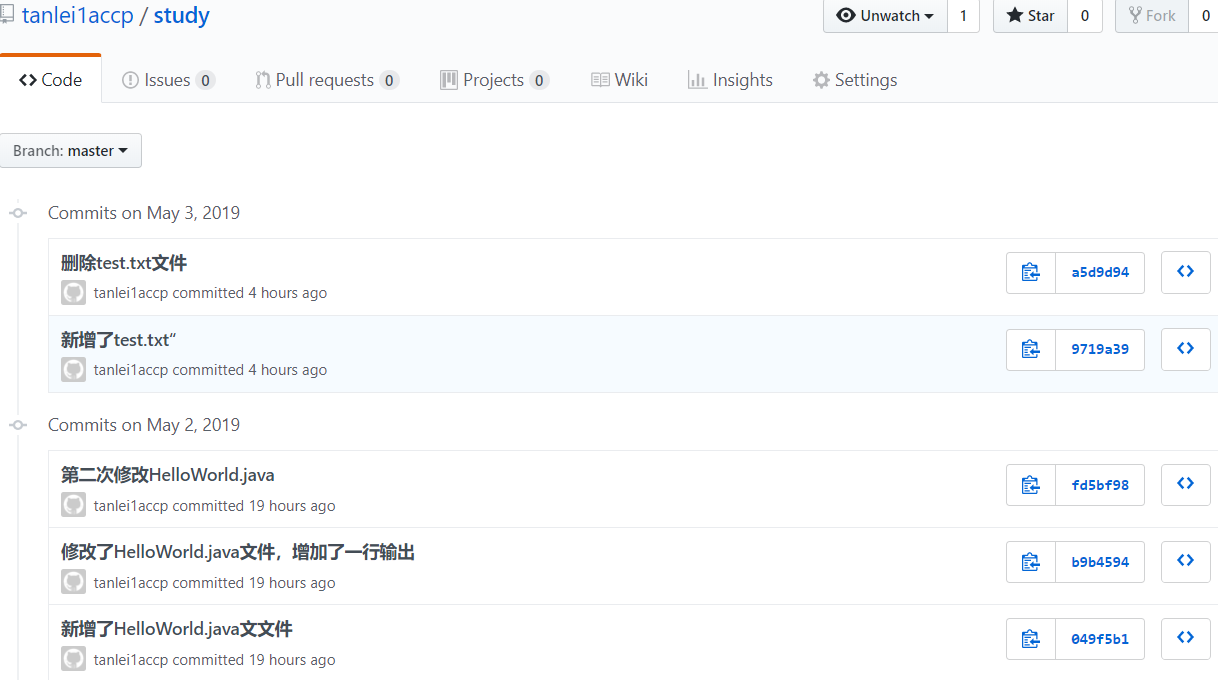 点击5commits可以查看到以前所有的日志信息,如下图所示: