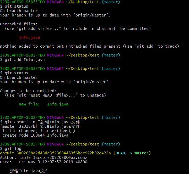 这个时候本地仓库已经有了新的Info.java文件,但是远程仓库当中并没有,需要在本地执行git push origin master将本地文件推送到服务器仓库中,如下图所示: