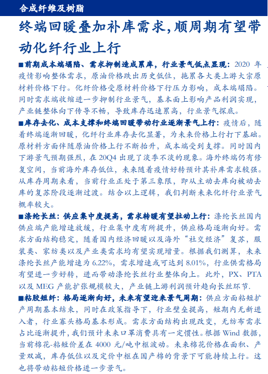 本文主要是介绍合成纤维及树脂行业:终端回暖叠加补库需求,顺周期有望带动化纤行业上行(20210116).PDF,希望对大家解决编程问题提供一定的参考价值,需要的开发者们随着小编来一起学习吧!