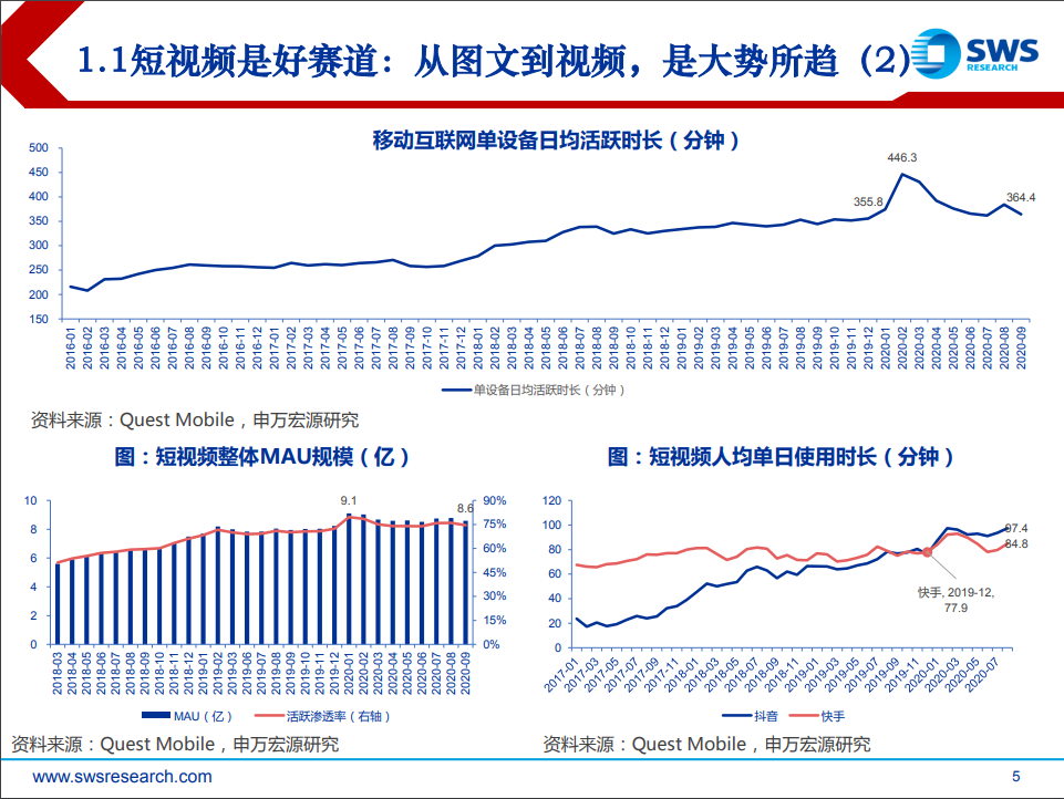 资料核心介绍:短视频是确定趋势: 1)从图文到视频,消费和生产门槛降低,承载信息更丰富;4G流量提速降 费是基础;2)算法推荐实现从人找信息到信息找人;3)短视频贡献移动互联网时长主要增量, 正成为互联网的基础设施。