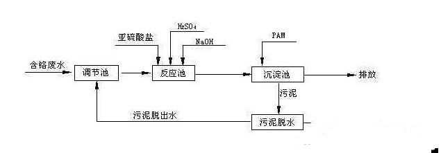 目前电镀废水中对铬的处理工艺一般为先将毒性较大的六价铬还原为三价铬,再对三价铬进行处理。使用的还原剂目前一般为:亚硫酸氢钠、焦亚硫酸钠、亚铁、硫化钠等。其中,硫化钠需在碱性环境中投加反应时间过长、亚铁产生的泥量过多,具体还原剂的选择需根据现场实际情况酌情选择。需注意的是,还原剂需在酸性环境下投加,一般PH控制在2-3左右,并且还原剂实际投加量需大于理论投加量,一般为1.2倍,不可投加太过量,否则会造成废水COD升高。现较多工厂出现使用二级还原,即在用二氧化硫或者其他还原剂预还原的条件下用联氨对其再次进行深度还原。另外有些工厂利用电化学还原法、微电池电解同样能达到将六价铬还原为三价铬的目的。