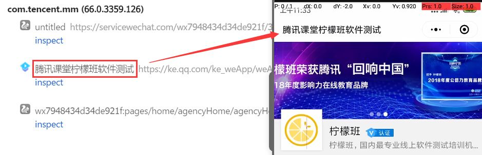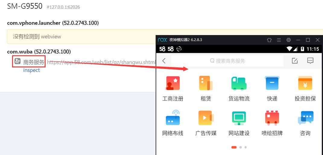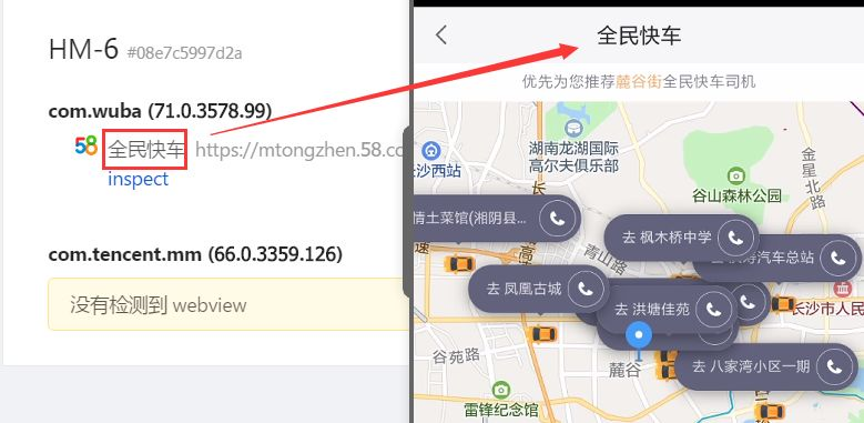 以58同城举例,打开之后进行到H5页面,即可点击inspect探测到当前H5页面信息