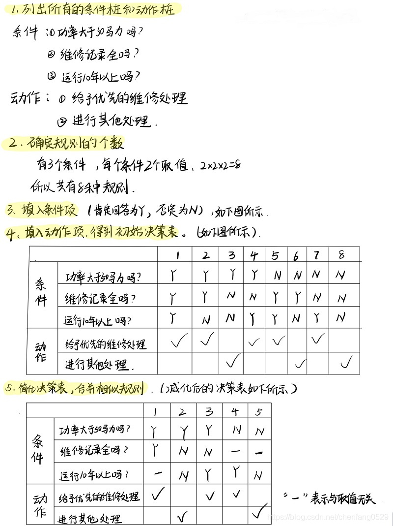 问题要求:”......对功率大于50马力的 机器、维修记录不全或已运行10年以上的机 器,应给予优先的维修处理......” 。这里假 定,“维修记录不全”和“优先维修处理” 均已在别处有更严格的定义 。请建立判定表。