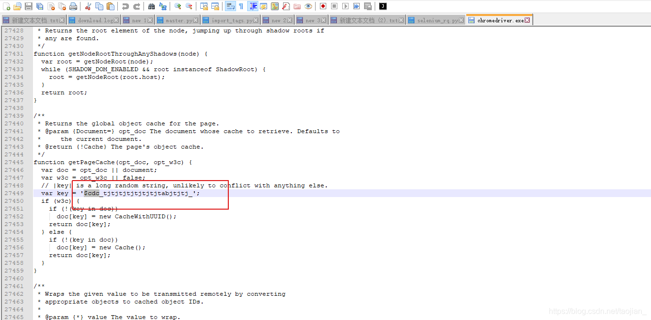 下载一个nodepadd++ 编辑器,右击打开 chromedriver.exe ,一群乱码,莫慌,莫随意打空格或者其他操作,可能会导致文件损坏。打开it,如下图(本文章计划唯一的一张图),ctrl + F, 输入 $cdc ,好了,就把下面那 红色框住的那一坨改了,就是它,淘宝就是检测的它。fuck.....