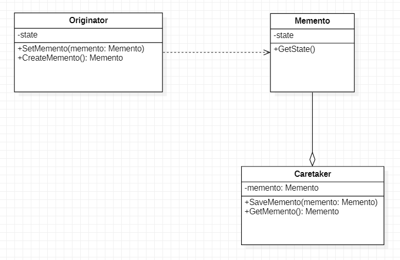 详细:Originator内部状态用state表示,其可以保存到一个Memento,为安全起见,Memento内部一般不设置改变state的方法,仅在构造器中完成state的初始化赋值。