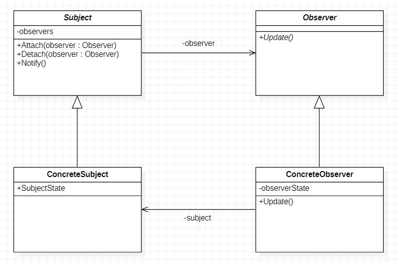 详细:Subject中常含有一个集合,如List<Observer>来包含观察者对象,在ConcreteSubject的相关属性改变之后,调用Notify()方法通知集合中的观察者调用Update()来刷新自己相关状态。