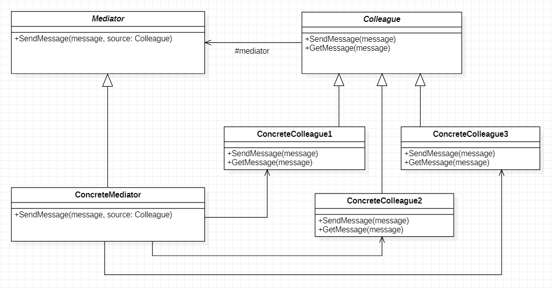 详细:各个Colleague通过中介者进行消息转发,但是随着加入的Colleague具体类增加,中介者Mediator会变得越来越复杂,有必要进行思考是否合理。中介者模式一般应用于一组对象以定义良好但是复杂的方式进行通信的场合。