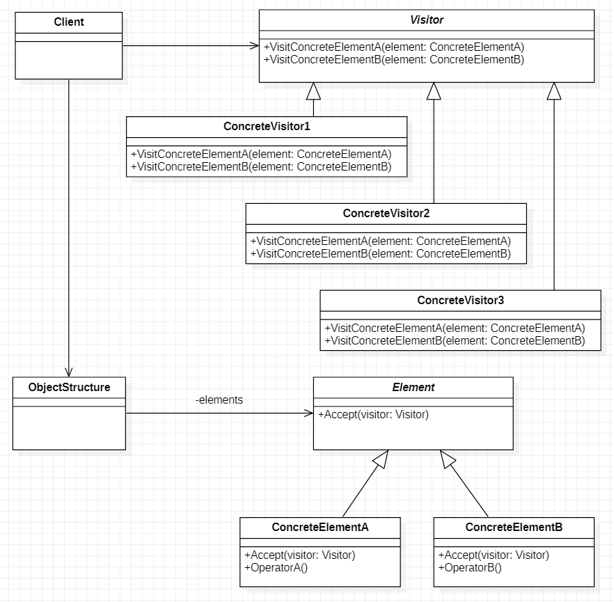 public class ConcreteElementA extends Element{...public void Accept(Visitor visitor){...visitor.VisitConcreteElementA(this);...}