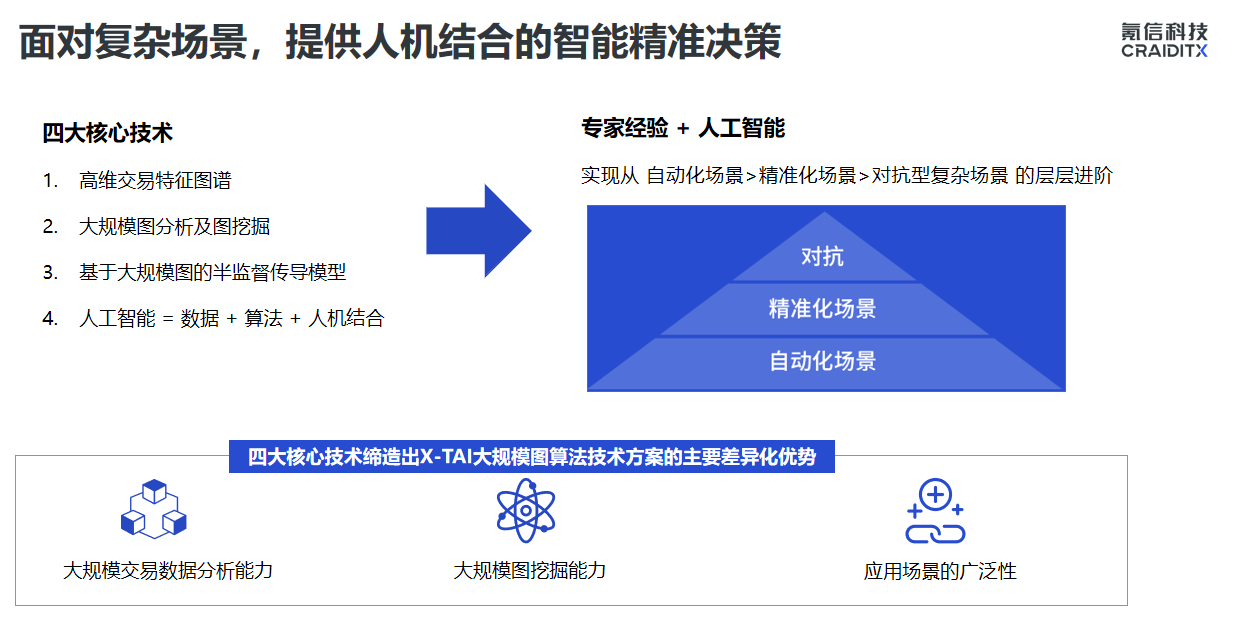 在与某股份制银行APP智能营销项目的合作中,氪信通过深度挖掘海量数据背后的隐含关联,解决跨领域间数据标签、逻辑关系的整合难题,成功助力行方在金融领域中实现生活化探索,拓宽金融知识图谱应用边界;服务实体经济层面,X-TAI帮助行业客户解决团体欺诈识别难、海量异构数据处理难等痛点,打破传统静态规则风险识别桎梏,提供覆盖度更高、准确率更高、效率更高的风险识别体系,应用于风险控制的技术方案,经过专家复核,团伙欺诈识别精准度可达90%,为普惠业务智能化转型提供了科技驱力。