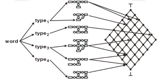 其中,数据库的DBMS 给出类型(type或sense,纯粹修辞的),概念域给出规范图(criteria 或 tense,纯粹文法的)。它们对应转变过程中的两个关键术语:句子系统Satzsystem(以一个给定的句法和词汇所陈述的句子或命题的一个系统)和证明系统Beweissystem(为一个Satzsystem定义一个逻辑的证明系统)。