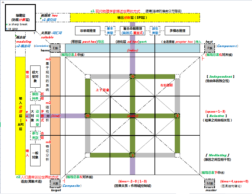- 右侧的三个表示实体本身的性质的三分法的三个标示:表示了“物自体的独立性”的“Independent”、表示了“结果之间自相关性”的“Relative”和表示了“原因之间互相干性”的“Mediating”。它们分别和中下的代表了“因果关系的控制域 ”部分的“(time= 1~3”)相对-其图示为顶点在p点的光锥的横截面(下图中右下的图C )。