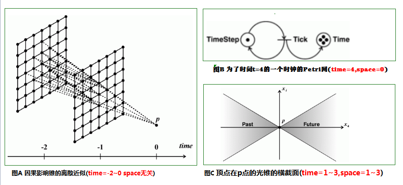 - 下中、右中 、和 右下的有关时域和空域的标示。代表“因果关系的作用域或控制域 ”的“(time=-2~0 | 1~3”),代表“结果之间自相关性”的“(space=1~3)“”和代表了“因果结构理论”的 (time=4,space=0)-其图示为在t=4的一个时钟的petri网(下图中右上的图B )
