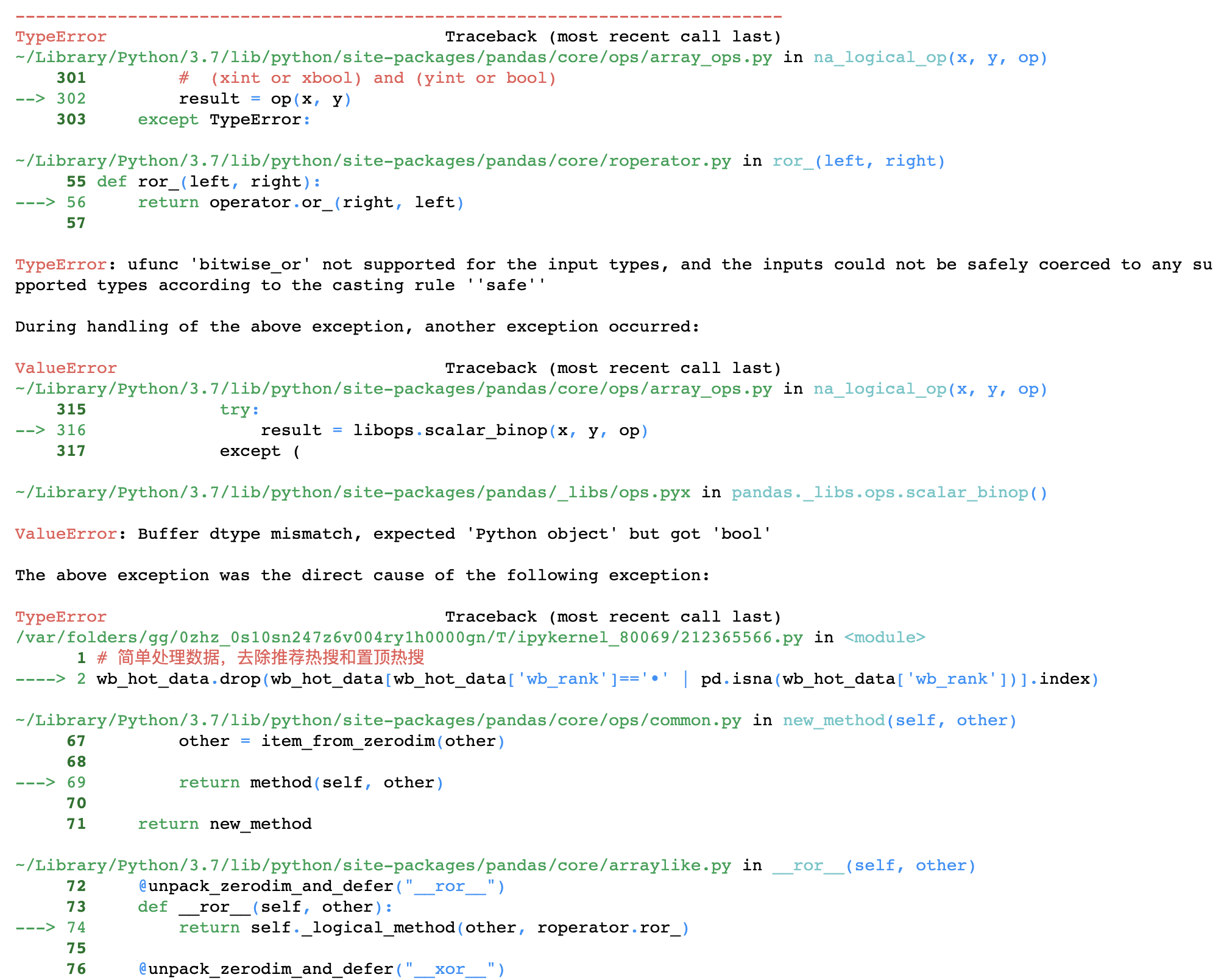也许你没有看出来改了什么,其实就是给wb_hot_data['wb_rank']=='•'加了一个括号。