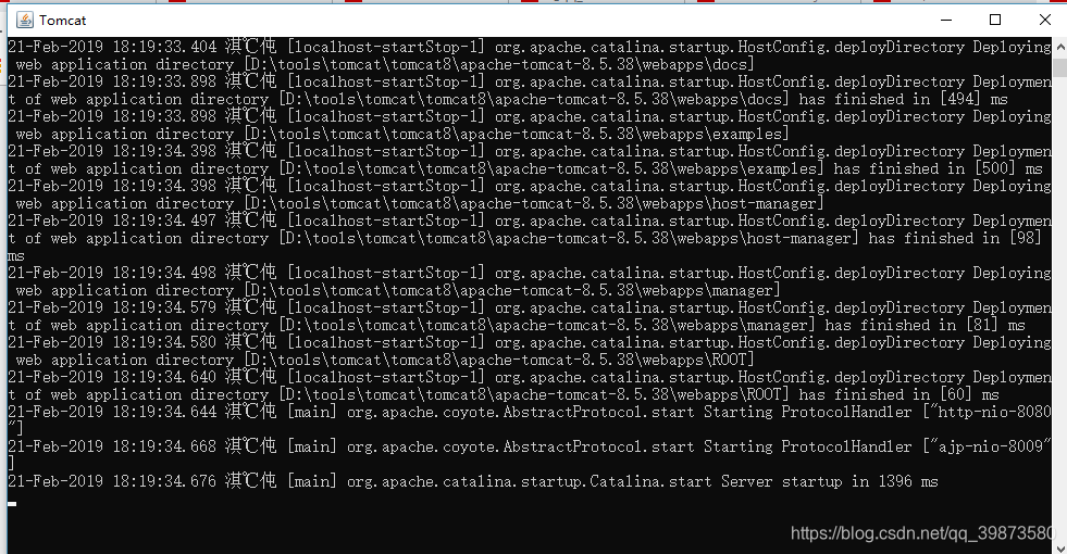 这时进入D:\tools\tomcat\tomcat8\apache-tomcat-8.5.38\bin目录下双击startup.bat出现下面的界面内容则安装成功