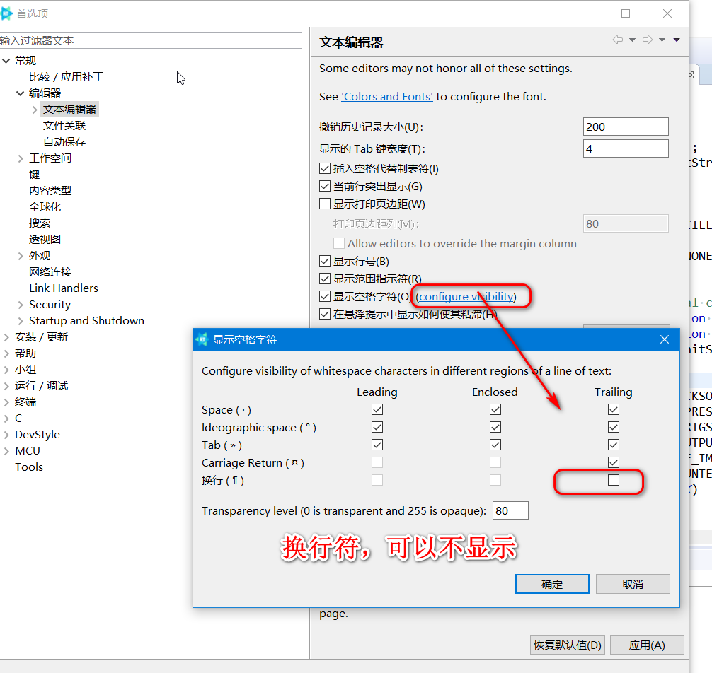 可以不显示【换行符】,点击【configure visibilit】,去掉换行的【勾选】