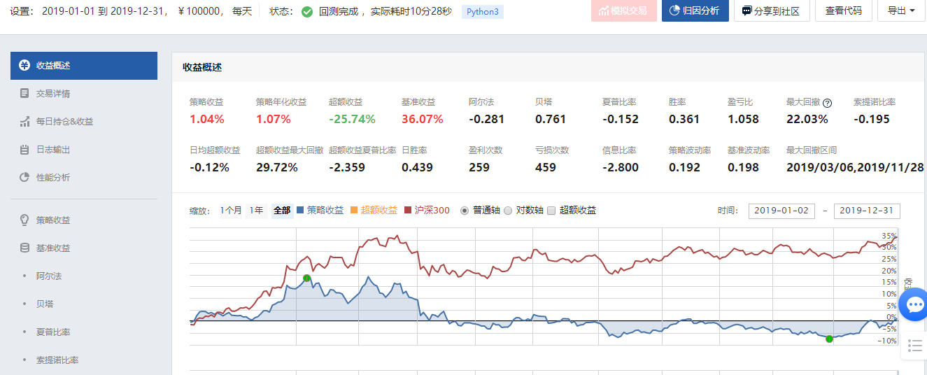 先让大家回忆一下MACD这个策略本身的表现,我们看看2019.1.1-2019.12.31这段时间,如果交易沪深300的股票,那么取得什么样的收益呢?