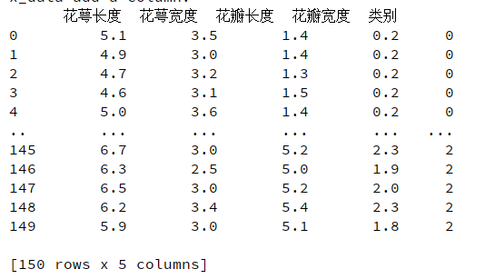 print("y_data from datasets: \n",y_data)x_data = DataFrame(x_data,columns=['花萼长度','花萼宽度','花瓣长度','花瓣宽度'])