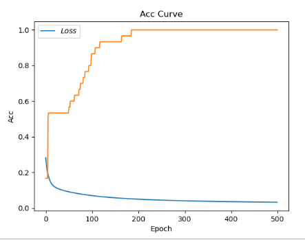 从图中可以看出在我们完成500轮训练之后,分类准确率达到了100%,总的来说模型准确率不错,接下来看看绘制的Accuracy和Loss曲线。