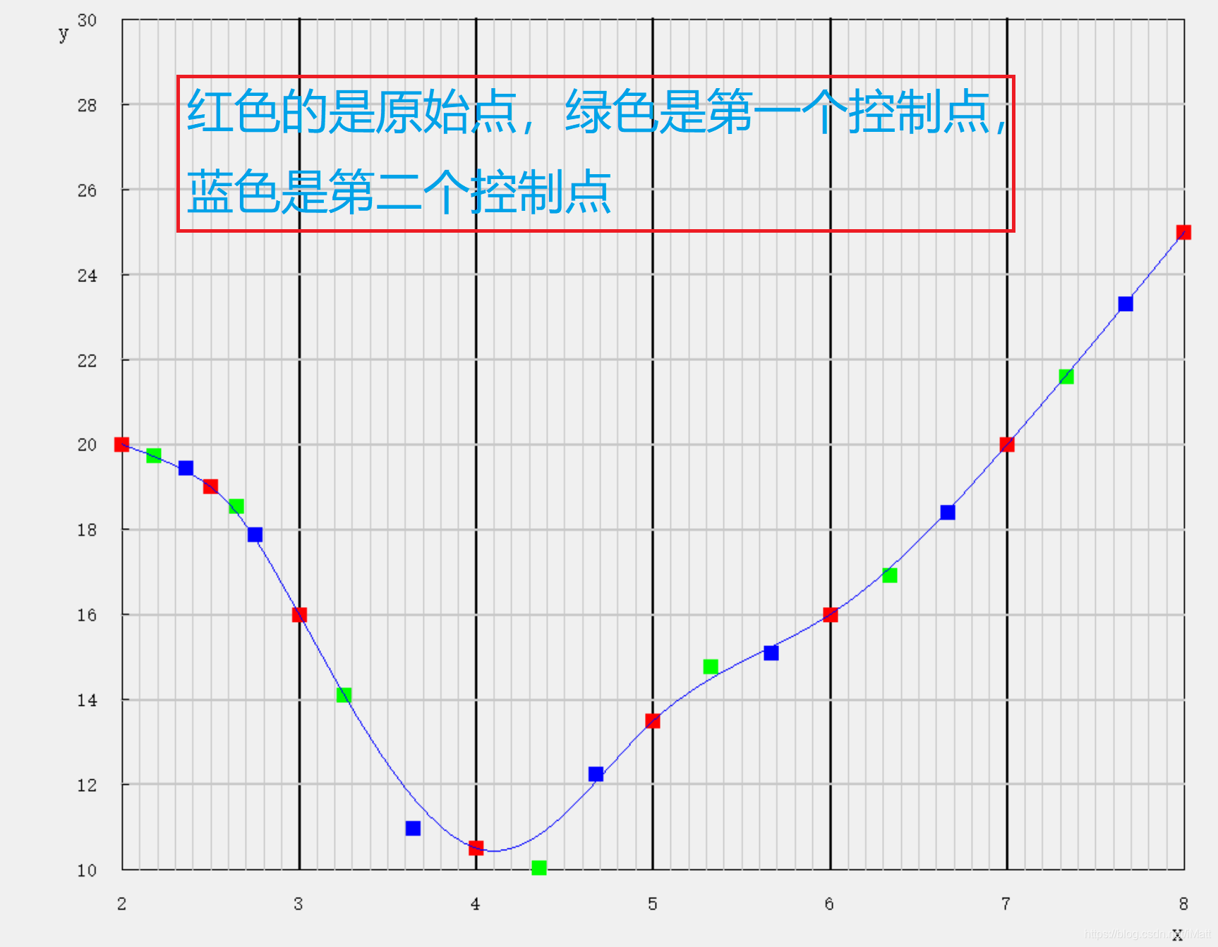 std::vector<BezierSplie::Point2D> rawPointVector;rawPointVector.push_back( BezierSplie::Point2D(2.0f,20.0f) );rawPointVector.push_back( BezierSplie::Point2D(2.5f,19.0f) );rawPointVector.push_back( BezierSplie::Point2D(3.0f,16.0f) );rawPointVector.push_back( BezierSplie::Point2D(4.0f,10.5f) );rawPointVector.push_back( BezierSplie::Point2D(5.0f,13.5f) );rawPointVector.push_back( BezierSplie::Point2D(6.0f,16.0f) );rawPointVector.push_back( BezierSplie::Point2D(7.0f,20.0f) );rawPointVector.push_back( BezierSplie::Point2D(8.0f,25.0f) );std::vector<BezierSplie::Point2D> firstPointVector;std::vector<BezierSplie::Point2D> secondPointVector;BezierSplie::CalculateControlPoint( rawPointVector,firstPointVector,secondPointVector );printf("\nfirst control point:\n");for( auto it = firstPointVector.begin(); it != firstPointVector.end(); ++it ){printf("(%f,%f);", it ->X, it ->Y );}printf( "\nsecond second point: \n");for( auto it = secondPointVector.begin(); it != secondPointVector.end(); ++it ){printf("(%f,%f);", it ->X, it ->Y );}