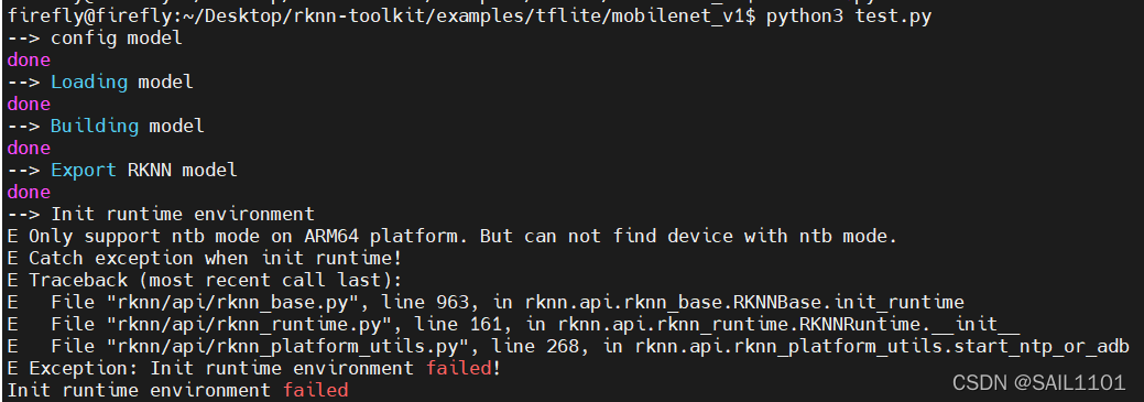 在运行官方提供的example时,出现Init runtime environment错误,报错如下: