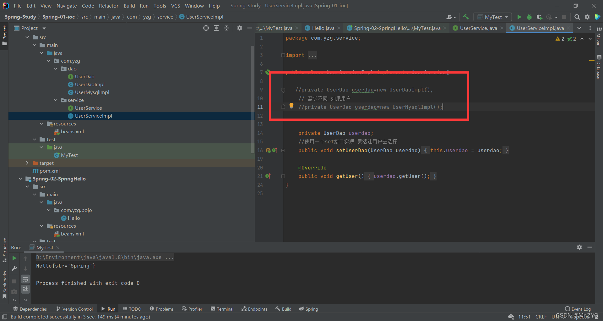 一般项目是在 业务层实现用户的需求 如写了两个 Dao Mysql两个接口实现。之前我们就要去业务层 new对象 调用这两个接口。
