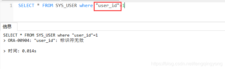 例:下图中我的表中字段是大写,但是我查询语句带上了双引号,就认为是小写,所以不被识别;但是当我去除双引号时,不论是大写还是小写,都认为是大写