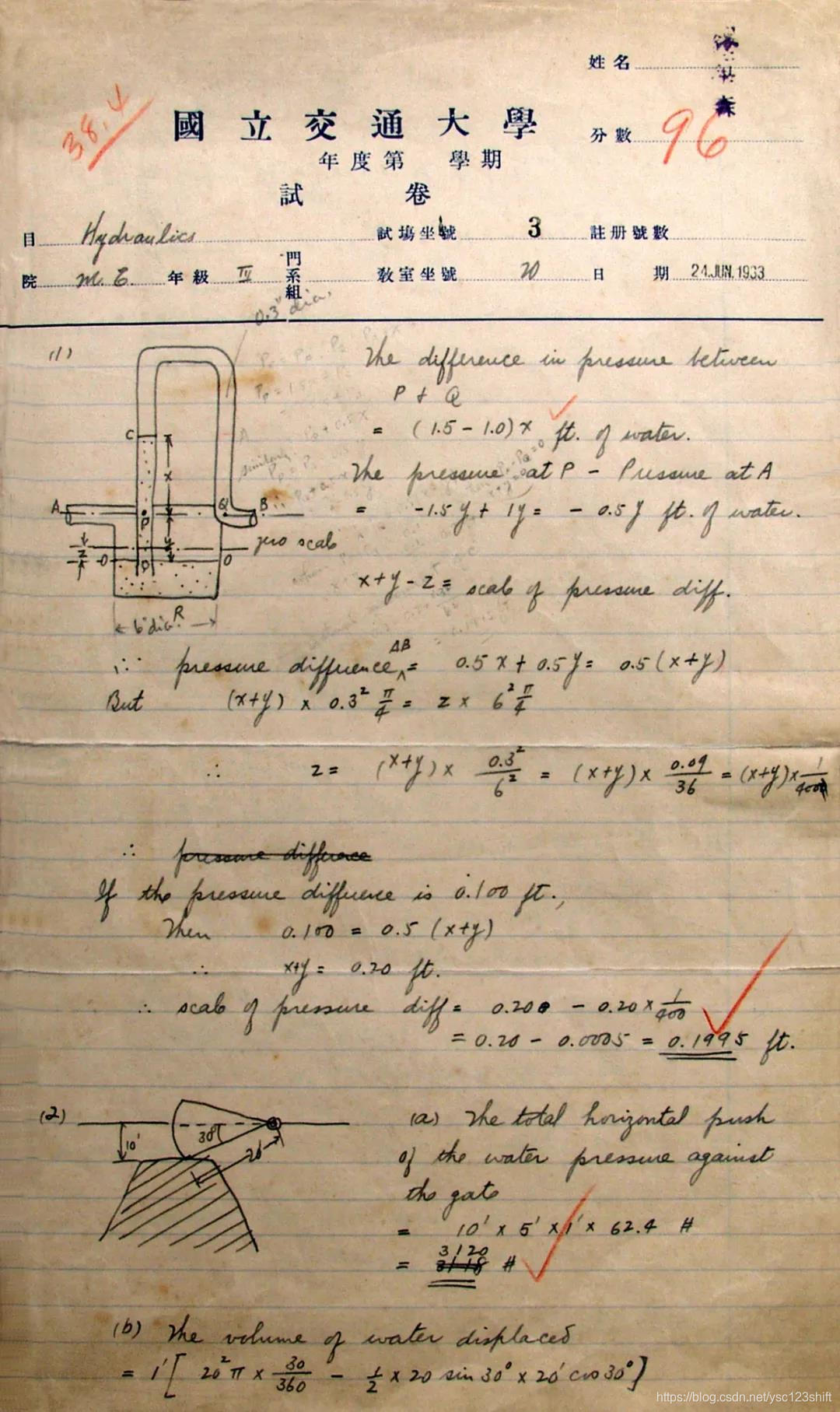 卷首时间是1933年6月,钱学森考的水力学课程。