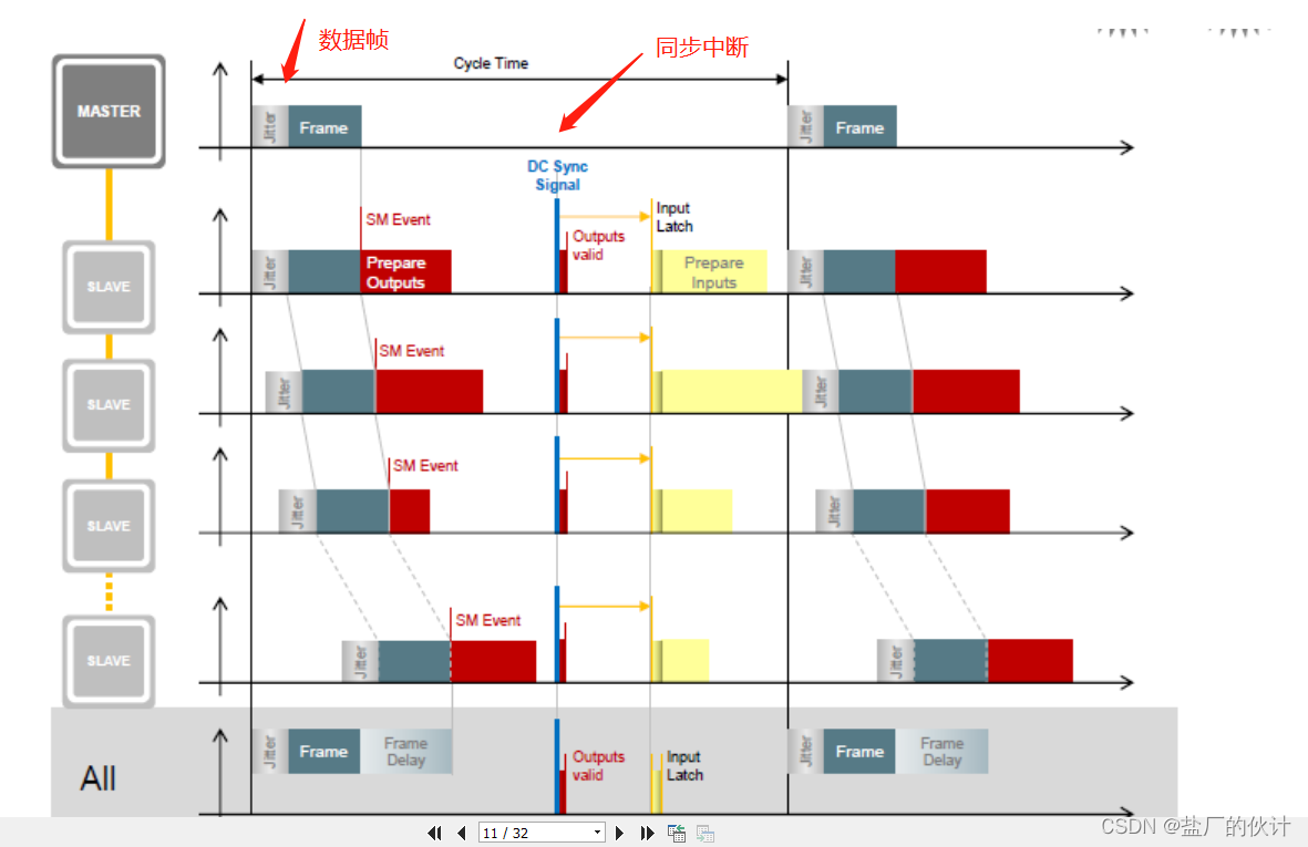 结合主站看(上图),主站定时发送数据帧,从站接收数据帧,距离越远的从站,接收到的数据帧的时间越晚,所以为了保证数据的同步,在数据帧和同步中断之间必须有足够的时间给从站接收和处理数据,这就是偏移时间的由来。像TwinCAT一般预留周期的30%的时间作为偏移时间,有些主站不能够设置这个偏移时间,比如基恩士和欧姆龙的PLC,就找不到对应的设置,理解为内部自动预留了一个偏移时间(用户无法设置)。