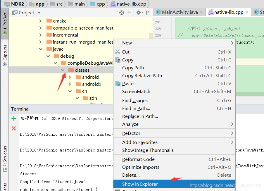 (例如我的Studen全类名是cn.zdh.ndk.Student) 可以选择类 鼠标右击选择Copy Reference 就可以获取这个类的全类名