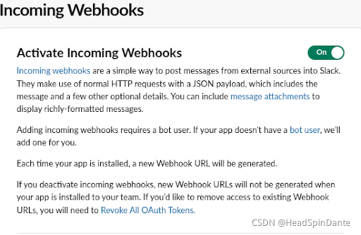 第 2 步:在 Slack 插件中启用传入 Webhooks 功能,以允许它在 Slack 中发布来自外部来源的警报。