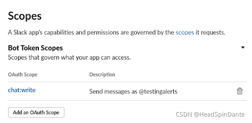 第 2 步:从应用管理页面转到应用设置,然后从导航菜单中选择 OAuth 和权限功能。 向下滚动到 Scopes 部分,然后从下拉菜单中选择 chat:write。 此范围将使应用程序能够代表其发送消息。