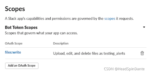 第 2 步:从应用管理页面转到应用设置,然后从导航菜单中选择 OAuth 和权限功能。 向下滚动到 Scopes 部分,然后从下拉菜单中选择 files:write。 此范围将使应用程序能够代表其发送消息。