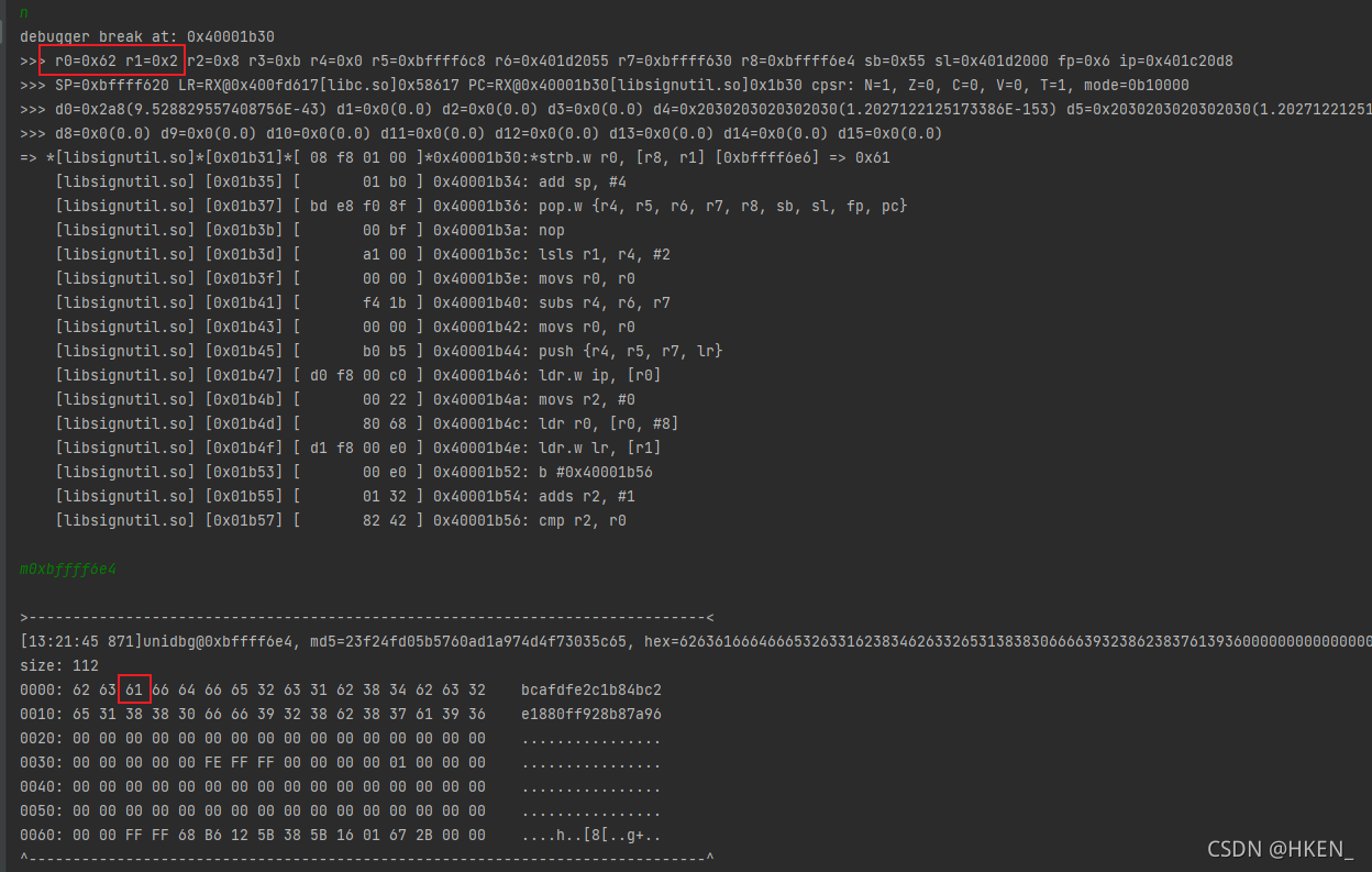 发现确实修改了,那么现在问题的关键就是 R0 和 R1 寄存器是什么时候被赋的值。