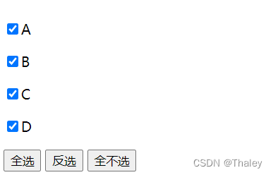 </head><body><form action=""><p><input type="checkbox" name="" id="">A</p><p><input type="checkbox" name="" id="">B</p><p><input type="checkbox" name="" id="">C</p><p><input type="checkbox" name="" id="">D</p></form><button>全选</button><button>反选</button><button>全不选</button>