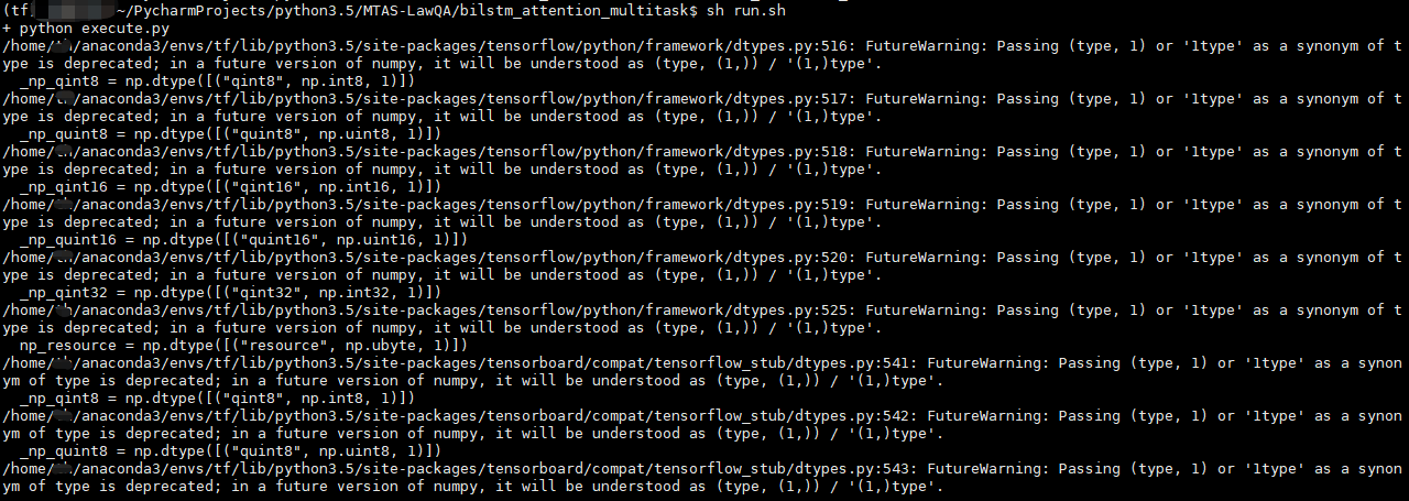 使用tensorflow写的深度学习模型,在服务器上跑模型时老是弹出/anaconda3/envs/tf/lib/python3.5/site-packages/tensorflow/python/framework/dtypes.py:516: FutureWarning: Passing (type, 1) or '1type' as a synonym of type is deprecated; in a future version of numpy, it will be understood as (type, (1,)) / '(1,)type'.