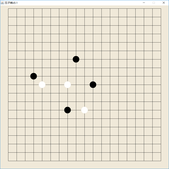 public class main extends JFrame {MyMouseListener mml = new MyMouseListener(this);// 将棋盘对象传到监听中,方便刷新protected chess[][] chess = new chess[19][19];// 建立棋子对象,每个位置有一个对象public void initUI() {for (int i = 0; i < 19; i++)for (int j = 0; j < 19; j++)chess[i][j] = new chess(i, j);this.setTitle("五子棋v0.1");this.setSize(1000, 1000);this.setResizable(false);// 大小不可变this.setLocationRelativeTo(null);// 默认居中this.setDefaultCloseOperation(3);// 按下叉号默认关闭this.getContentPane().setBackground(new Color(240, 233, 217));// 修改背景颜色this.setVisible(true);this.addMouseListener(mml);}public void paint(Graphics g) {super.paint(g);drawChessTable(g);}public void drawChessTable(Graphics g) {// 棋盘格局为19×19,每格的边长为50for (int i = 0; i < 19; i++)g.drawLine(50, 50 + i * 50, 50 + (19 - 1) * 50, 50 + i * 50);for (int j = 0; j < 19; j++)g.drawLine(50 + j * 50, 50, 50 + j * 50, 50 + (19 - 1) * 50);// 把棋子画上去for (int i = 0; i < 19; i++)for (int j = 0; j < 19; j++) {switch (chess[i][j].color) {case 0:g.setColor(Color.BLACK);g.fillOval(chess[i][j].x - 20, chess[i][j].y - 20, 40, 40);break;case 1:g.setColor(Color.WHITE);g.fillOval(chess[i][j].x - 20, chess[i][j].y - 20, 40, 40);break;}}}public static void main(String args[]) {new main().initUI();}}