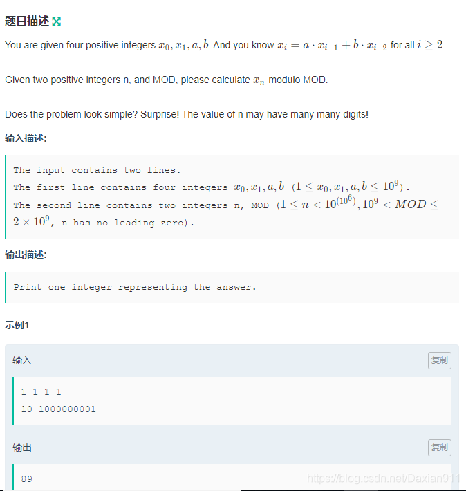 {ll x, y, a, b, mod, m, n;node ans, aa;scanf("%lld %lld %lld %lld", &x, &y, &a, &b);scanf("%s", s);scanf("%lld", &mod);int t = strlen(s);init();m = solve(mod), n = 0;for(int i = 0; i < t; i++) {n = ksc(n , 10 ,m) ;n = n + s[i] -'0';if(n >= m) n -= m;}aa.a[0][0] = a;aa.a[0][1] = 1;aa.a[1][0] = b;aa.a[1][1] = 0;ans = ksm(aa, n, mod);printf("%lld\n", (ans.a[1][1] * x + ans.a[0][1] * y) % mod );return 0;