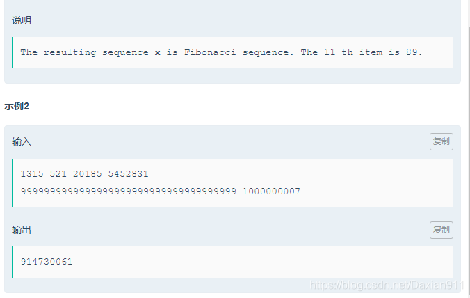 }node mul (node a, node b, ll mod) {node ans;memset(ans.a, 0, sizeof(ans.a));for(int i = 0; i < 2; i++) {for(int j = 0; j < 2; j++) {for(int k = 0; k < 2; k++) {ans.a[i][j] = (ans.a[i][j] + a.a[i][k] * b.a[k][j]) % mod;}}}return ans;