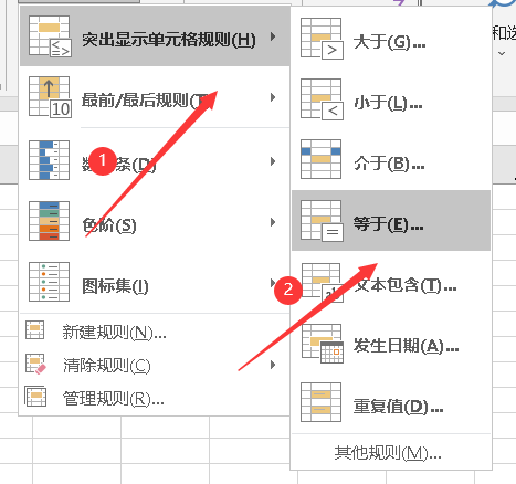 依次点击突出显示单元格规则,等于