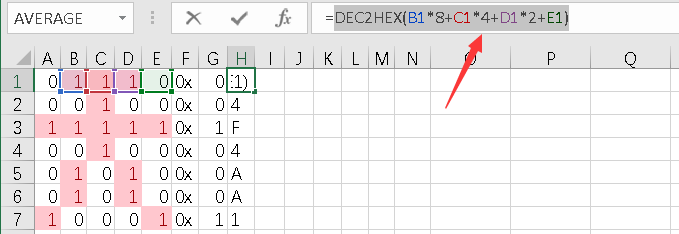 实现方法是EXCEL的公式(这个需要对EXCEL公式有一定了解,建议百度),如B1*8+C1*4+D1*2+E1计算出十进制的后四位和,再用DEC2HEX()函数转化为十六进制字符。