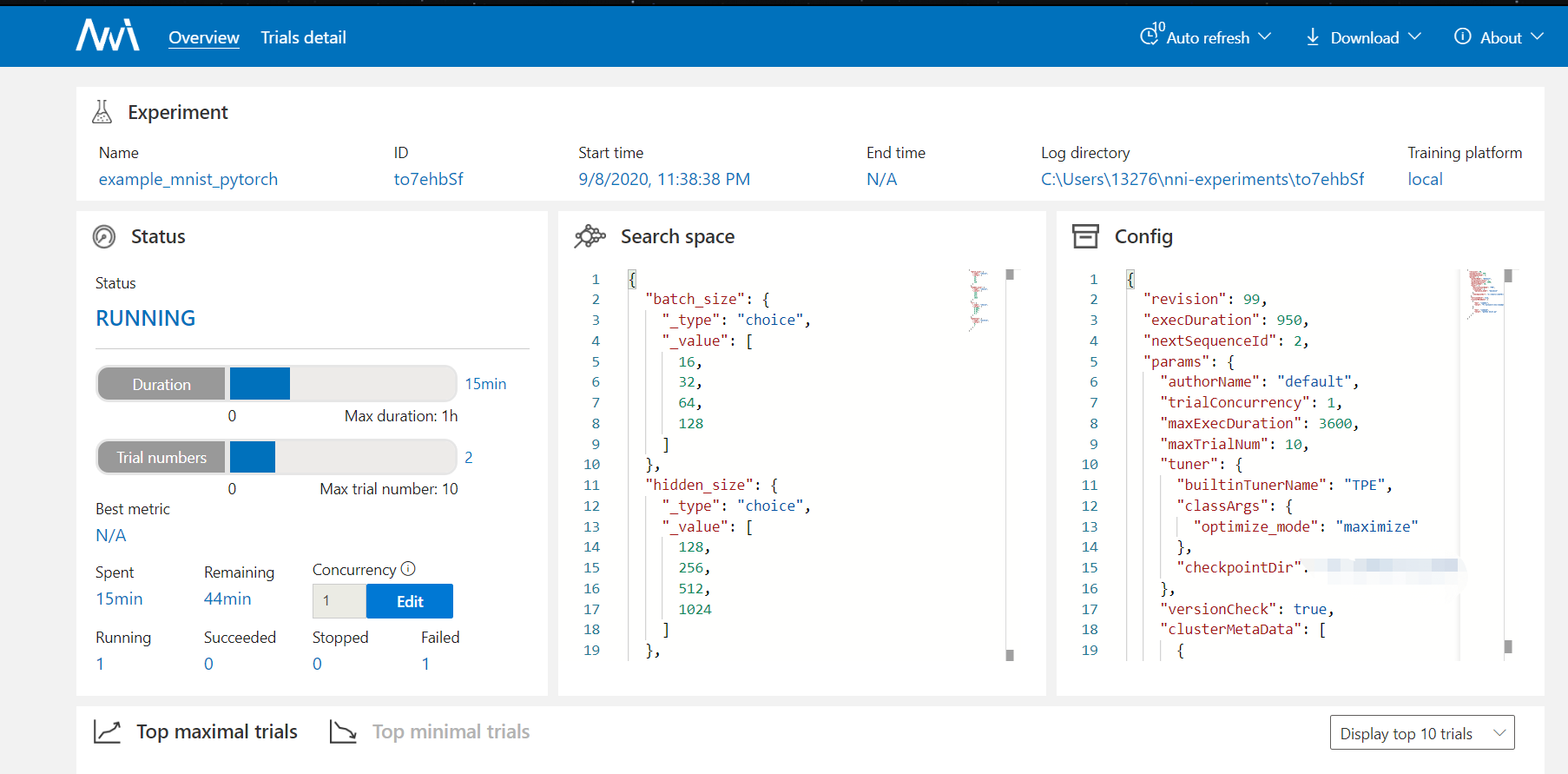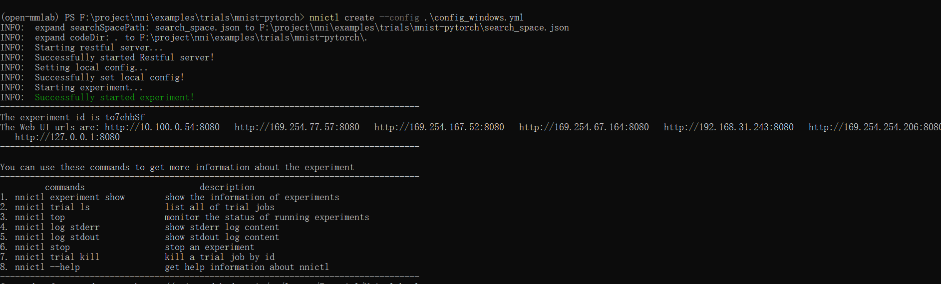 nnictl create --config nni\examples\trials\mnist-pytorch\config_windows.yml
