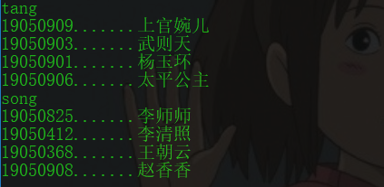 {public static void main(String[] args) {//<班级,学生>HashMap<String,HashMap<String,String>> school=new HashMap<String,HashMap<String,String>>();//<姓名,学号>HashMap<String,String> tang=new HashMap<String,String>();HashMap<String,String> song=new HashMap<String,String>();school.put("tang",tang);school.put("song",song);tang.put("杨玉环","19050901");tang.put("太平公主","19050906");tang.put("上官婉儿","19050909");tang.put("武则天","19050903");song.put("李师师","19050825");song.put("李清照","19050412");song.put("赵香香","19050908");song.put("王朝云","19050368");//遍历整个班级Iterator<String> keySet=school.keySet().iterator();//拿到tang,songwhile(keySet.hasNext()){String room=keySet.next();System.out.println(room);HashMap<String,String> stu=school.get(room);getStudent(stu);}}public static void getStudent(HashMap<String,String> hm){Iterator<String> it=hm.keySet().iterator();while(it.hasNext()){String name=it.next();String id=hm.get(name);System.out.println(id+"......."+name);}}